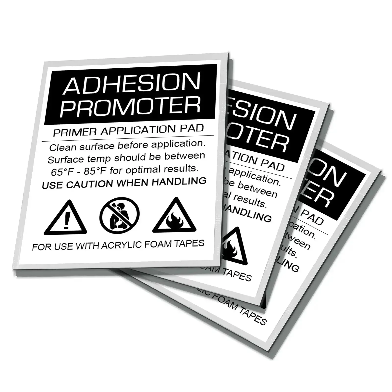 Application Tips: The bonding surface should be clean and dry. Contaminated surfaces should be cleaned with an untreated, lint-free cloth or to remove residue (wax, grease, dirt) use an isopropyl alcohol or paint prep solvent. Do not use in environmental conditions lower than 55°F. Apply a thin, uniform coating to the bonding surface, using the minimum amount that will fully coat the surface. Apply promoter only to areas that will be fully covered with tape. Although drying times may vary due to temperature and/or humidity, a drying time of 30-90 seconds is typically indicative of this thickness. The primer should be dry before applying tape. For best results, apply tape immediately after primer applica- tion or no more than one hour after primer application. Be sure the primed surface remains free from contaminants prior to tape application.